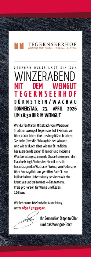 schön, dass Sie uns auf unserer Website besuchen – ich würde mich freuen, Sie bald auch persönlich im WEINGUT begrüßen zu dürfen! Machen Sie sich hier schon einmal ein Bild vom Wein- und Speisenangebot und der Philosophie, die hinter „meinem“ WEINGUT steht. Erkunden Sie unsere Weinkarte mit mehr als 200 Positionen – vom unkomplizierten Einstiegswein bis hin zur exquisiten Bouteille für Kenner.